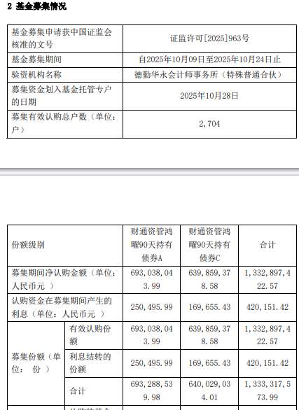 中国经济网北京10月29日电今日,财通证券资产管理有限公司就财通资管宏耀90天持有期债券投资基金协议的有效性发布公告。融资期内认购净额为1,332,897,422.57元,融资期内认购资金应计利息为420,151.42元,募集股份总数为1,333,317,573.99元。基金经理龚志芳于2010年7月加入浙江泰隆银行资金管理部,从事外汇、债券交易工作。 2012年3月加入宁波商业银行金融市场部筹备固定收益业务,主要负责股权及固定收益投资业务。行动。同时,我们于2015年初筹备并推出了自己的贵金属业务。2016年3月,加入财通证券资产管理有限公司,现任固定收益公募投资部基金经理。
